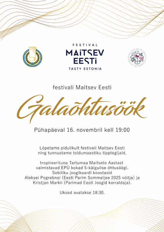 15 nov. Uudised Parimad Eesti Joogid 2025 võitjad on selgunud november 15, 2025 By angelika Laupäeval, 15. novembril, tunnustati Eesti Sommeljeede Assotsiatsiooni poolt Kultuurikatlas, festivali Maitsev Eesti raames, meie tored... Loe edasi